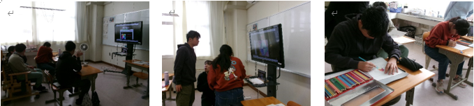 高等部3年生がリモートでオンラインアート教室に参加し、北海道近代美術館の学芸員の方と一緒に学習を行いました。普段は入ることができない作品収蔵庫から、ヴァザルリの「HEGYES」「ゲシュタルト・ゼルド」や、ライリーの「アレストⅠ」など錯視の効果を追求した作品を鑑賞し、「チカチカ光って見える」「ゆらゆら動いて見える」などと学芸員の方に感想を伝えていました。授業の最後のまとめでは、錯視の効果を使った絵に色を塗る学習をしました。